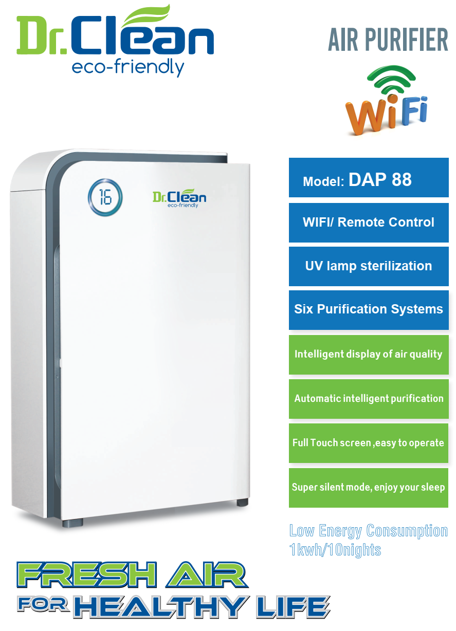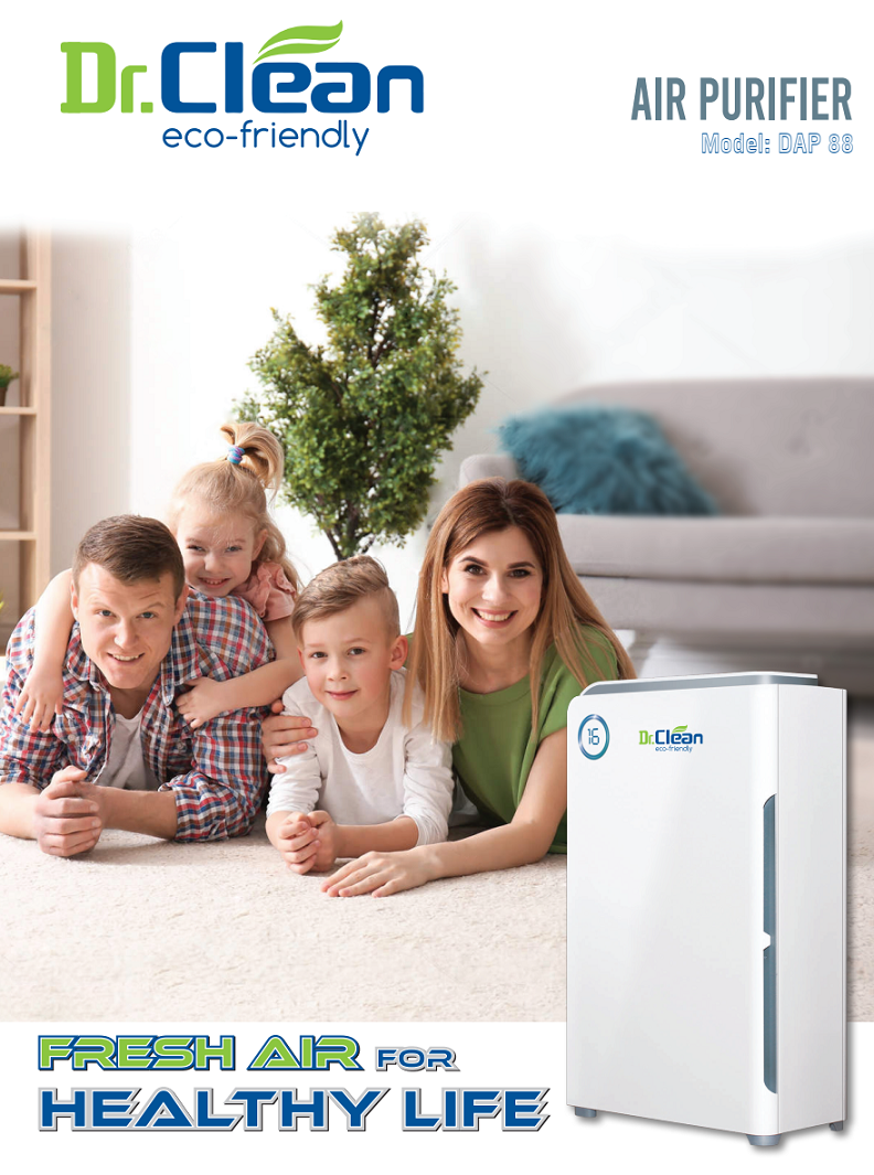 Máy lọc không khí Cao Cấp thương hiệu Dr.Clean model DAP88 công nghệ Đức với 6 lớp siêu lọc ngăn chặn bụi, virus, khử mùi,... đem đến cho căn phòng không khí sạch sẽ thoáng mát, dễ chịu, mềm mại, trong lành. Giúp cho gia đình có một giấc ngủ sâu, sảng khoái, mát dịu mỗi khi thức giấc.